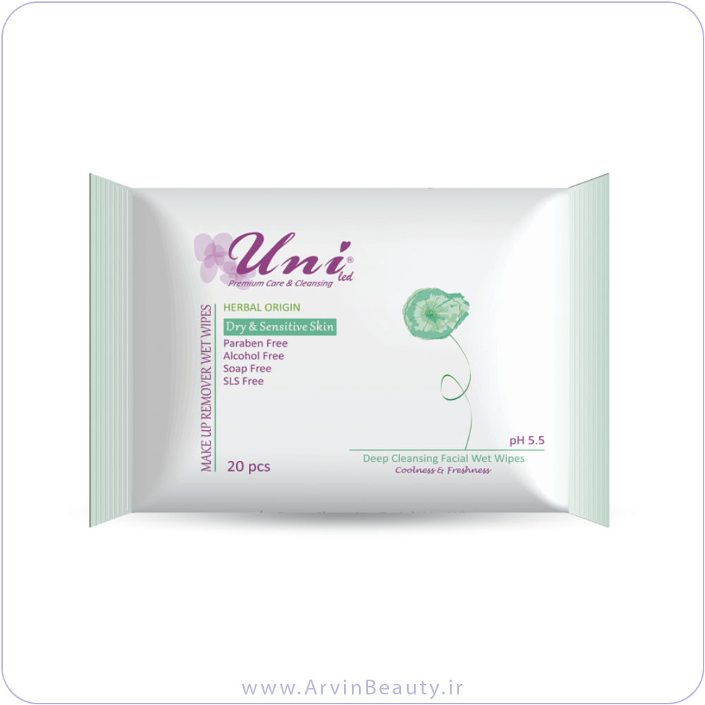 دستمال مرطوب پاک کننده آرایش یونی مخصوص پوست خشک و حساس 20 برگی